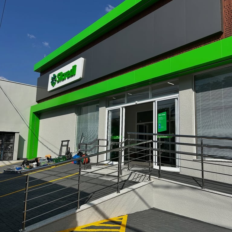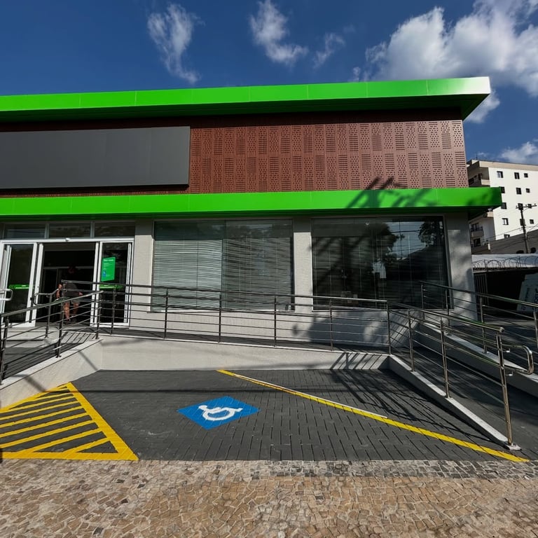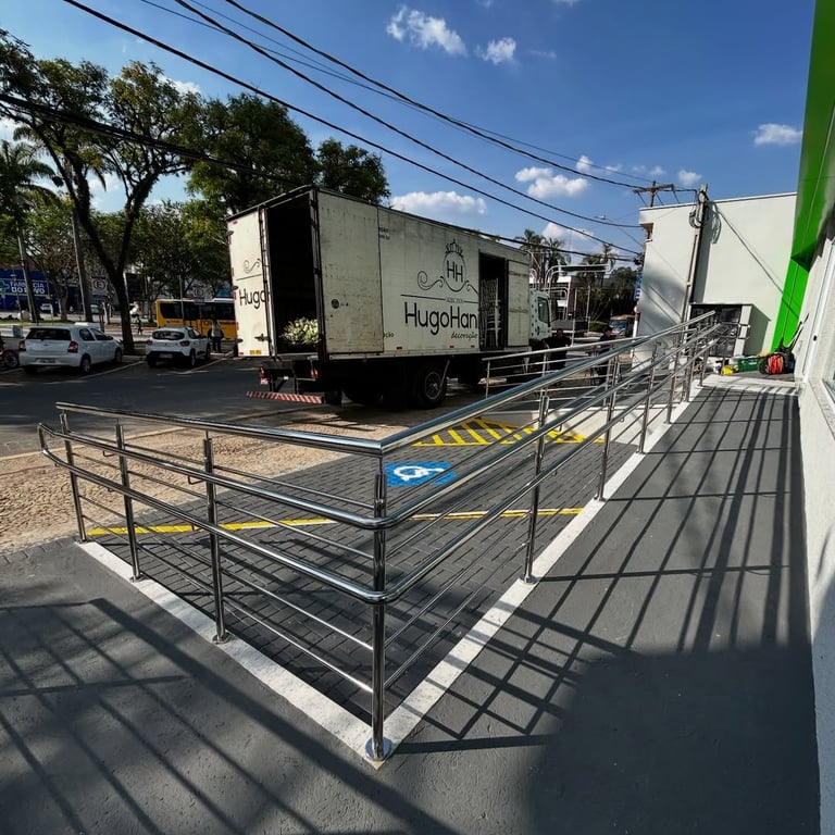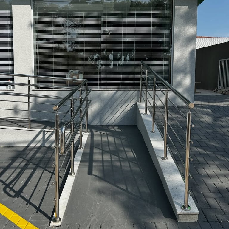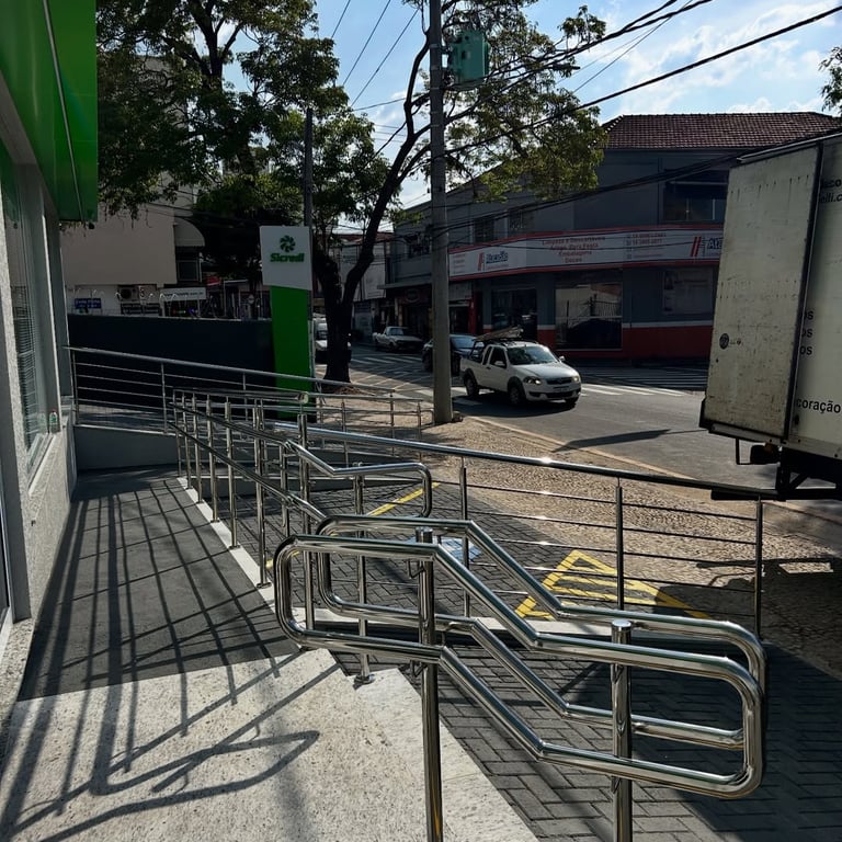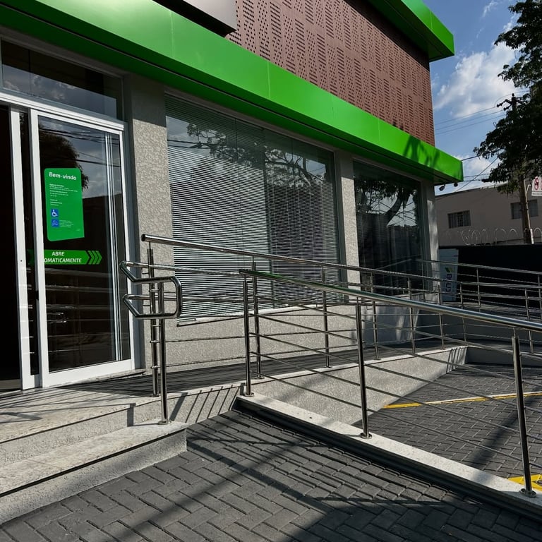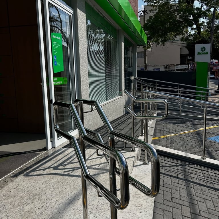 Neste projeto, realizamos a instalação completa dos corrimãos em inox na área de acesso da nova unidade do Banco Sicredi. A fachada possui uma rampa ampla e devidamente sinalizada, e o corrimão foi construído sob medida para garantir segurança, apoio firme e acessibilidade para todos os clientes.